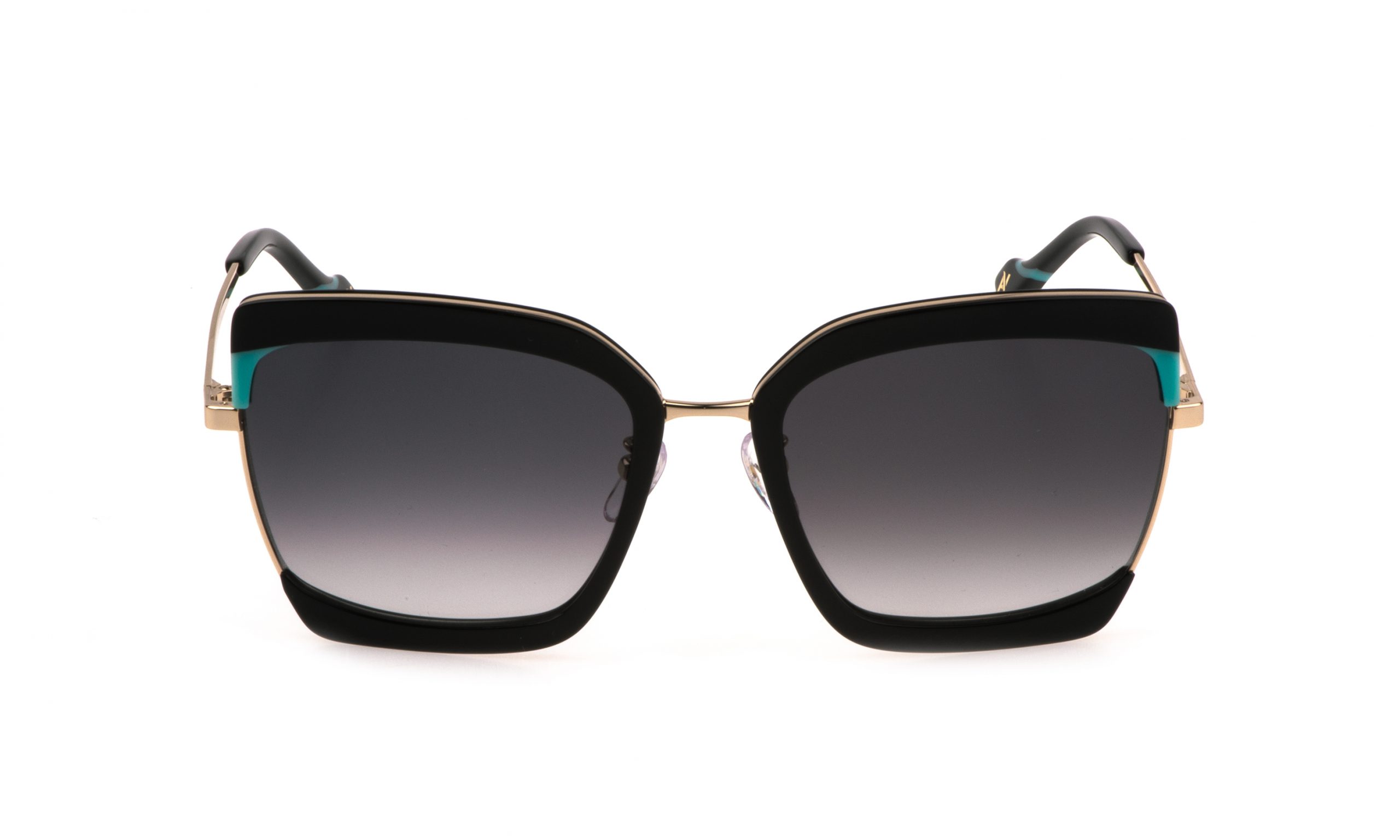 Die Sonnenbrille Rita hat eine eckige Front im Oversize-Format aus kombiniertem Acetat und Metall, die durch Verklebungen aus farbigem Acetat bereichert wird. Die dünnen Metallbügel ziert eine elegante Gravur des Monogramms. Es sind vier Varianten verfügbar.