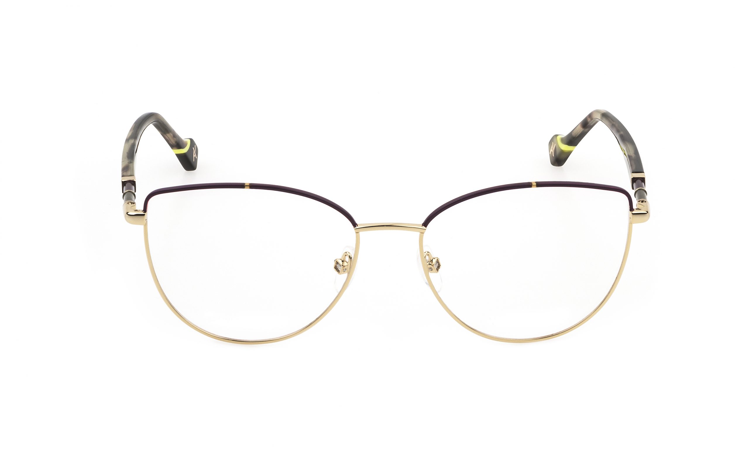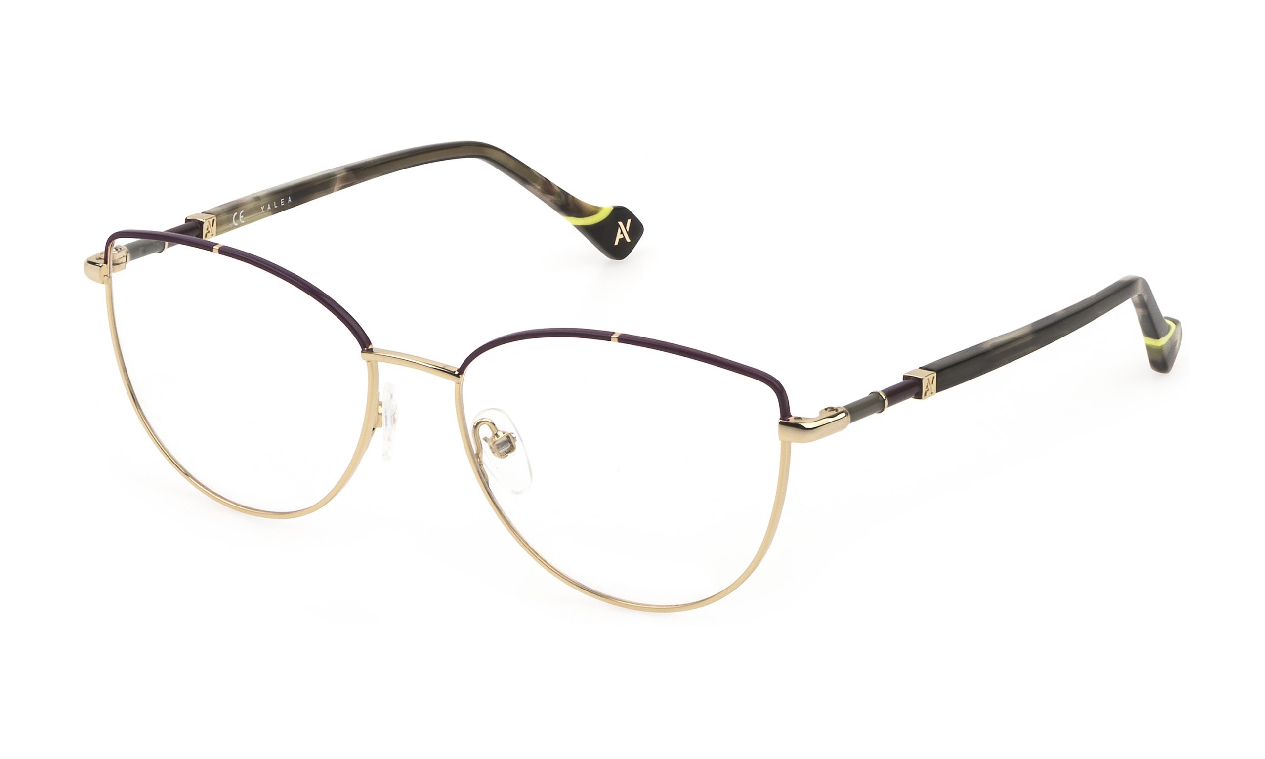 Clara es un modelo de vista con frente con forma de ojo de gato adornada con detalles de esmalte de colores. La varilla combinada con metal se caracteriza por la inserción de una sección redonda, por el esmalte bicolor y por el monograma grabado en un pequeño cubo metálico.