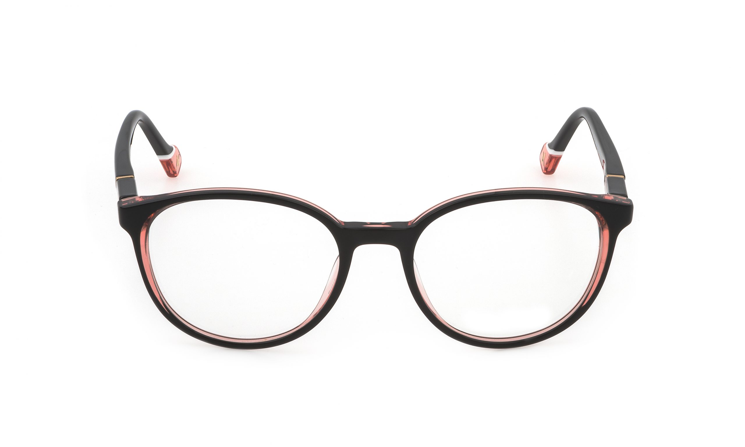 Anna is an optical frame with a round acetate front piece and temples with integrated flex hinge. The front piece features several glued two-tone acetate details, while the temples sport monochrome decorative elements. A modern and original eyewear style owing to the colour combinations and lines of the frame.
