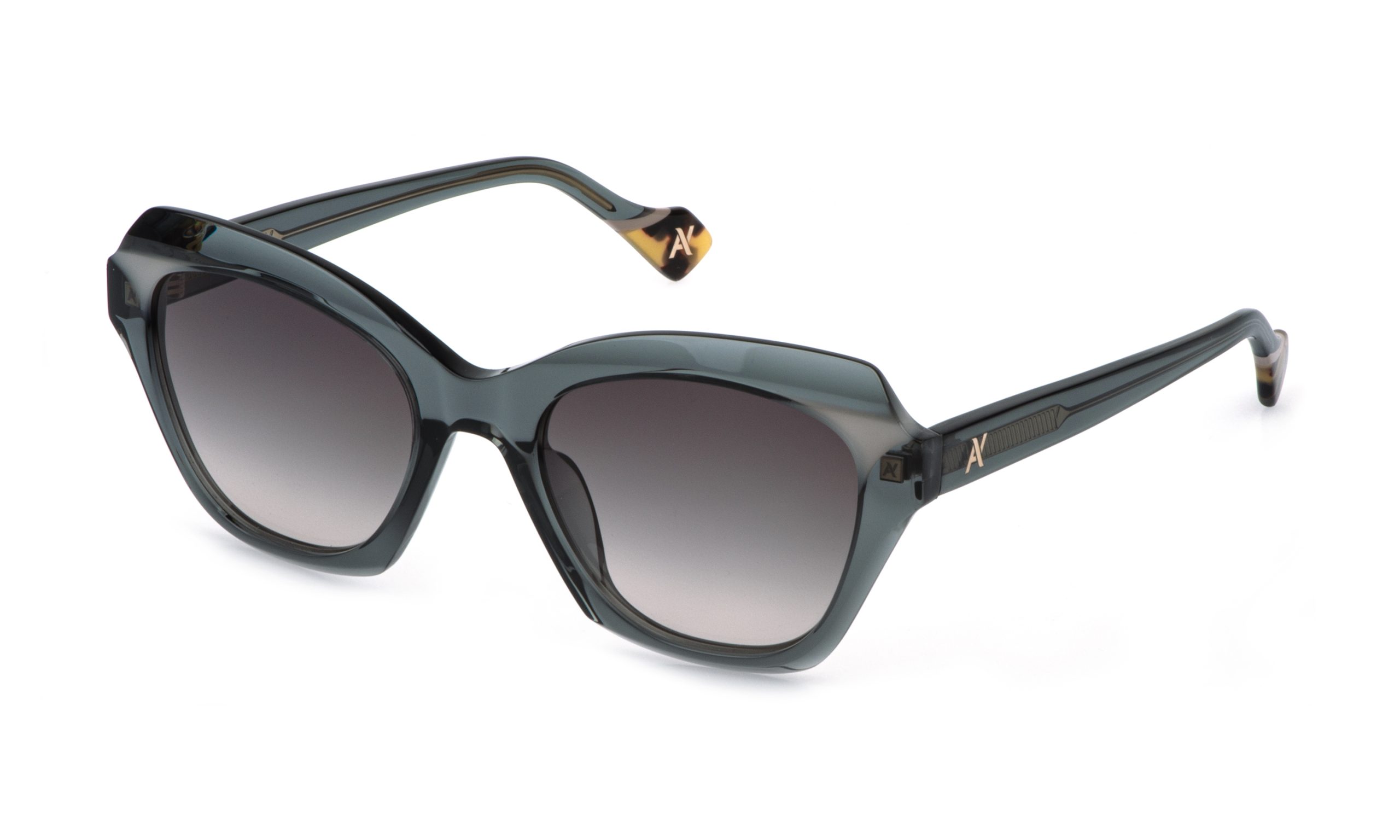 Barbara is a pair of sunglasses that blends character and refinement: the contemporary acetate front is sculpted with elegant facets that create depth and ever-changing light reflections. Alongside the classic version, the “V” variant adds a touch of exclusivity thanks to the delicate overlays applied to the frame. The temples, adorned with the AY monogram, complete the design with a distinctive signature that conveys elegance, care, and personality.