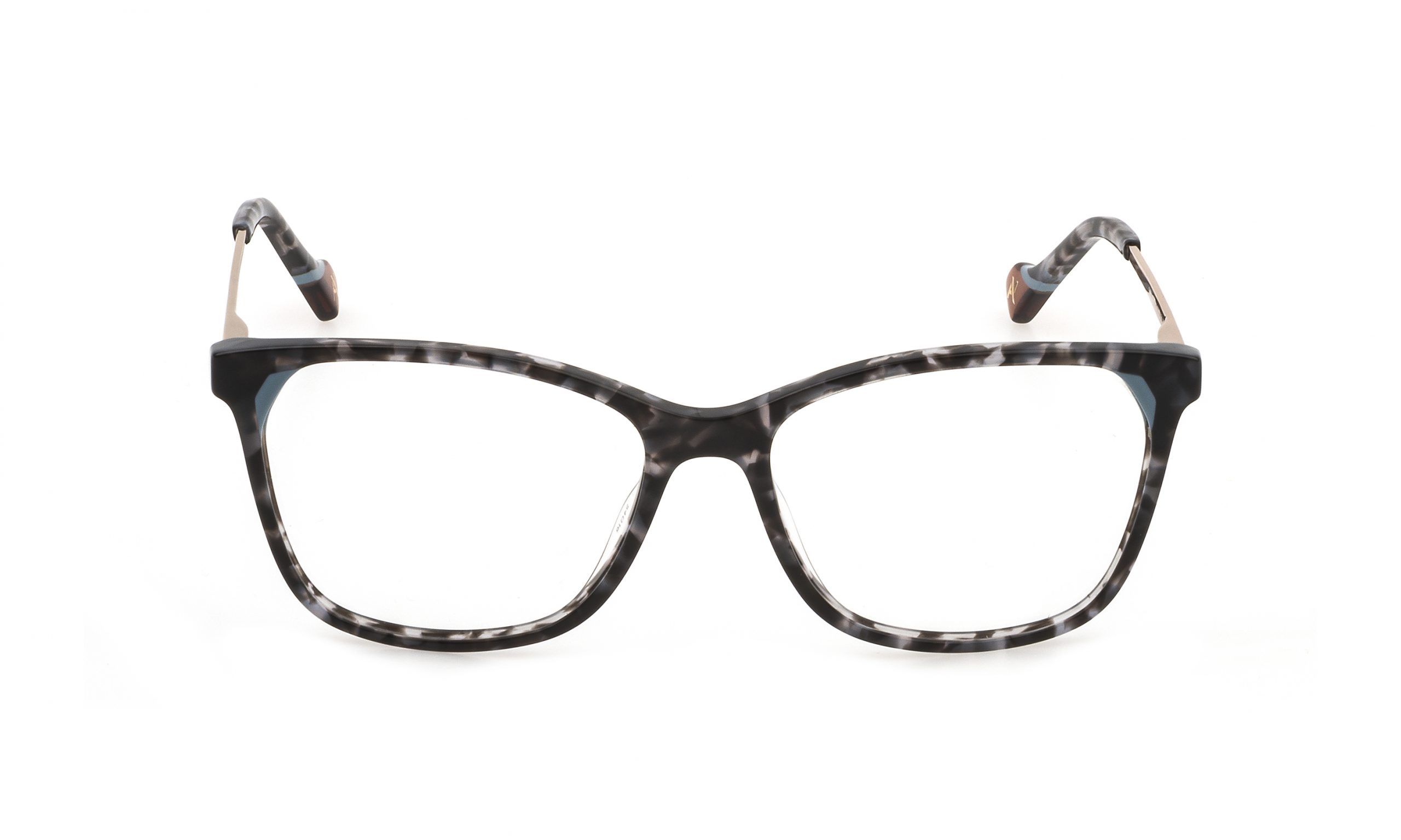 Elena is the optical style sporting slightly squared lines. This style is rendered unique by the glued acetate that accents the upper corners of the front piece. The combined temples feature a dainty engraved monogram on the metal part. The temple tips recall the materials and colours of the front piece.