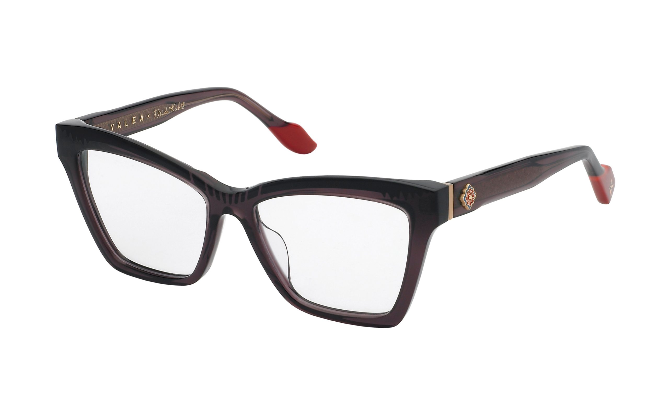 Eyeglasses style Strong from Yalea x Frida Kahlo collection represents the indomitable spirit and empowerment of the artist. The glasses are entirely made of acetate with a butterfly front, the temples are characterized by a personalized visible soul with Frida’s floral style. The right temple has been finished as if it were a red brush, while the left temple represents Yalea’s iconic spatula.