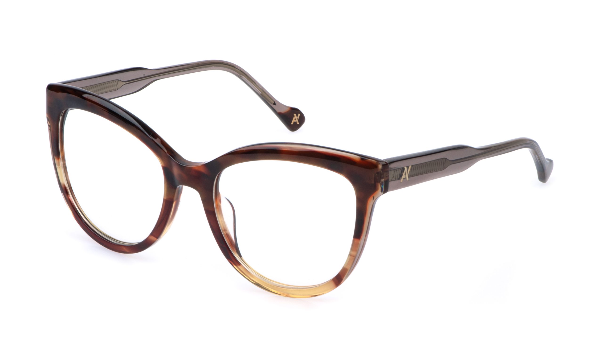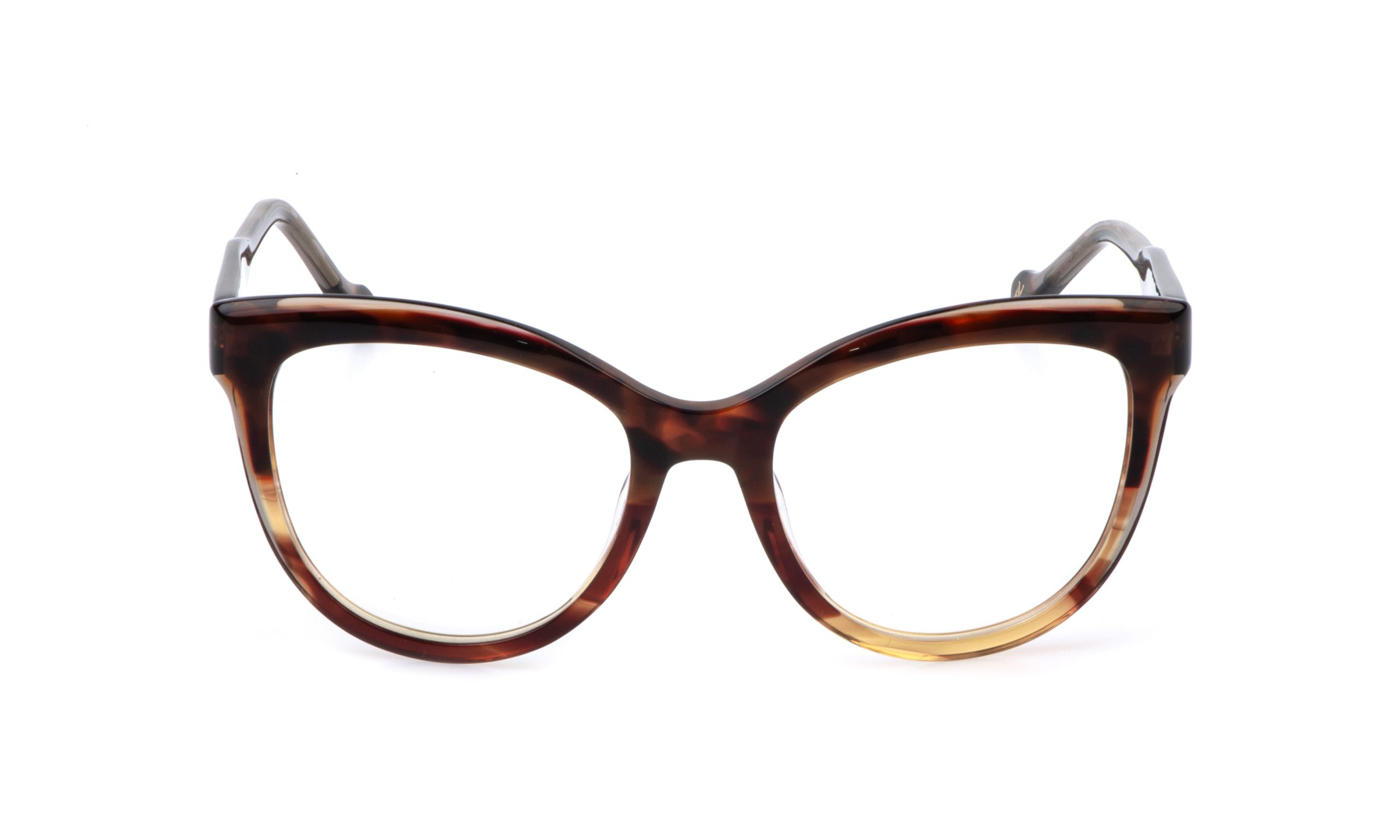 The Grazia eyeglasses have a rounded acetate front, enhanced by soft facets. The temples, also in acetate, are either transparent or solid-colored. The V versions are made with two different layers of acetate in contrasting or tone-on-tone colors.