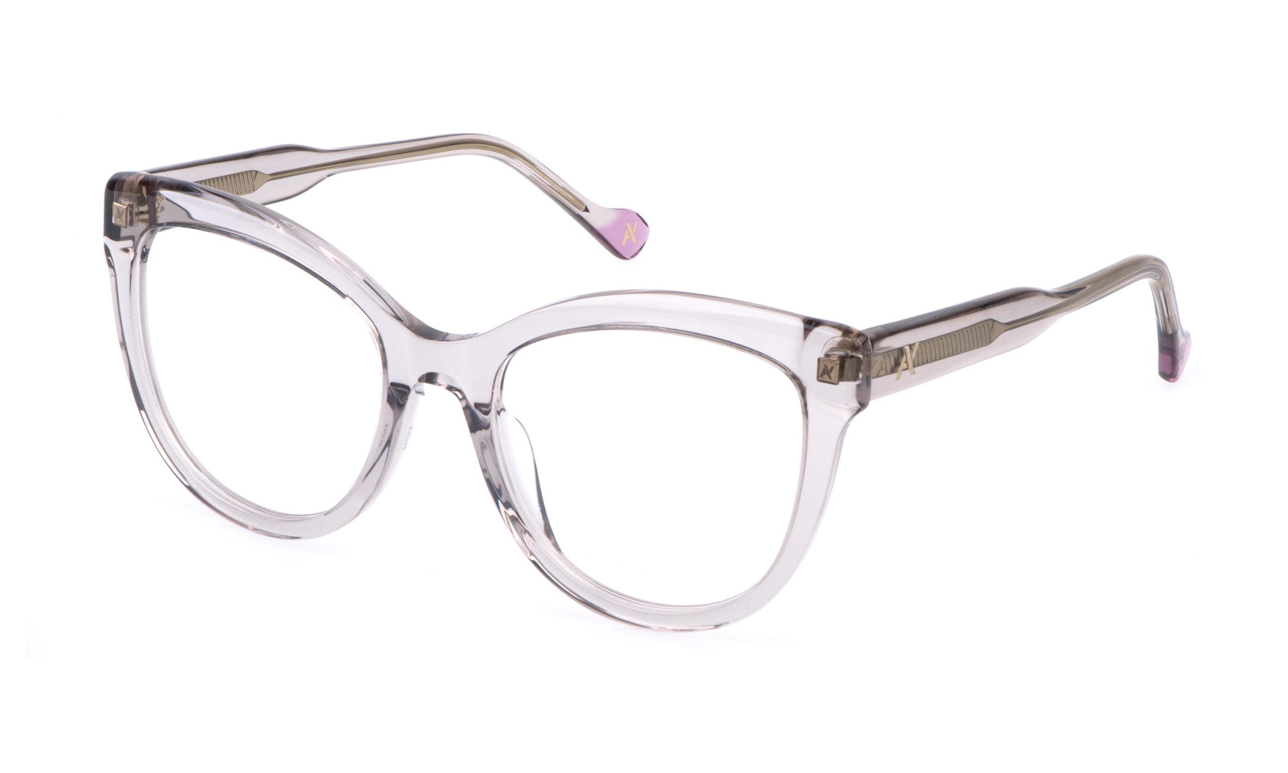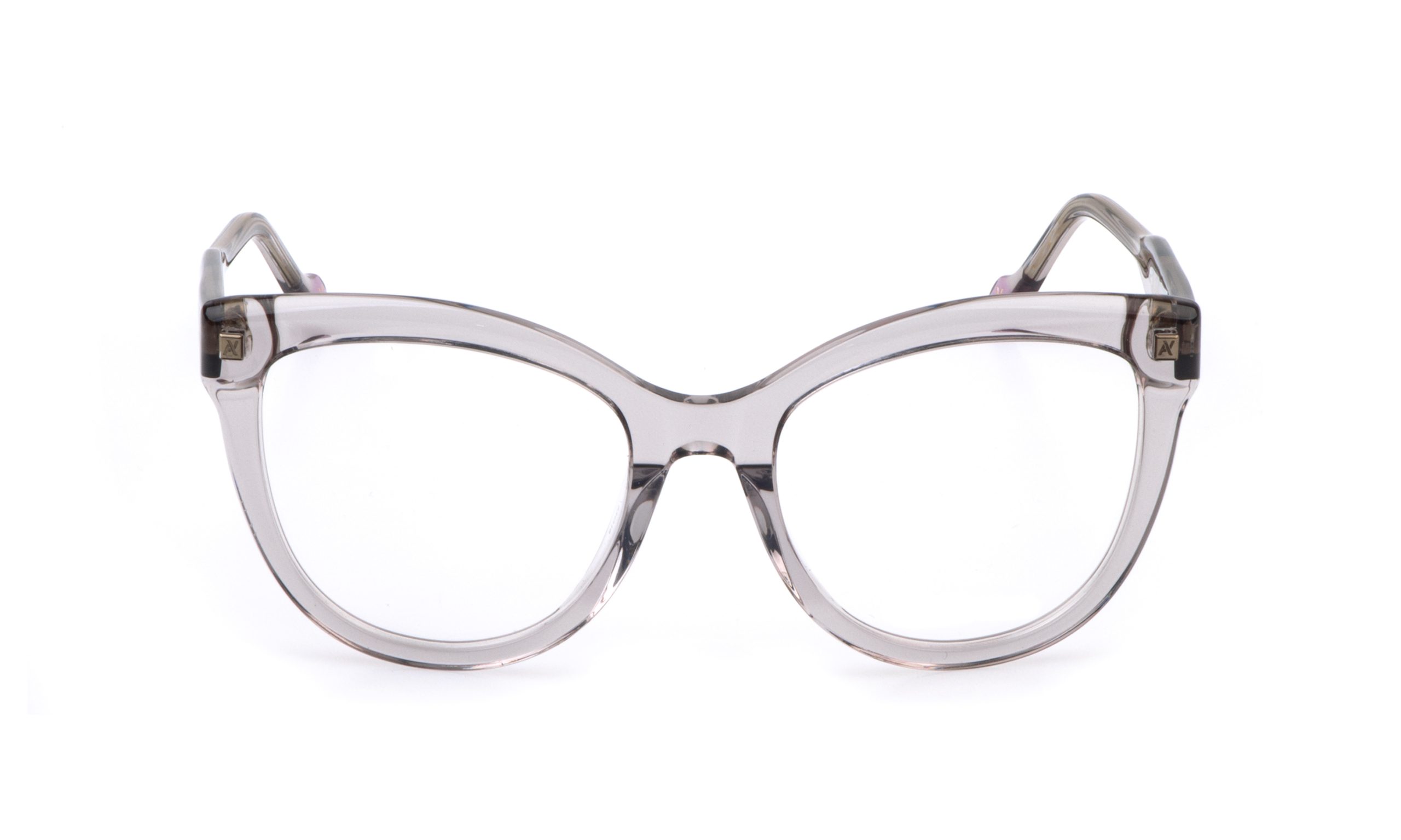 The Grazia eyeglasses have a rounded acetate front, enhanced by soft facets. The temples, also in acetate, are either transparent or solid-colored.