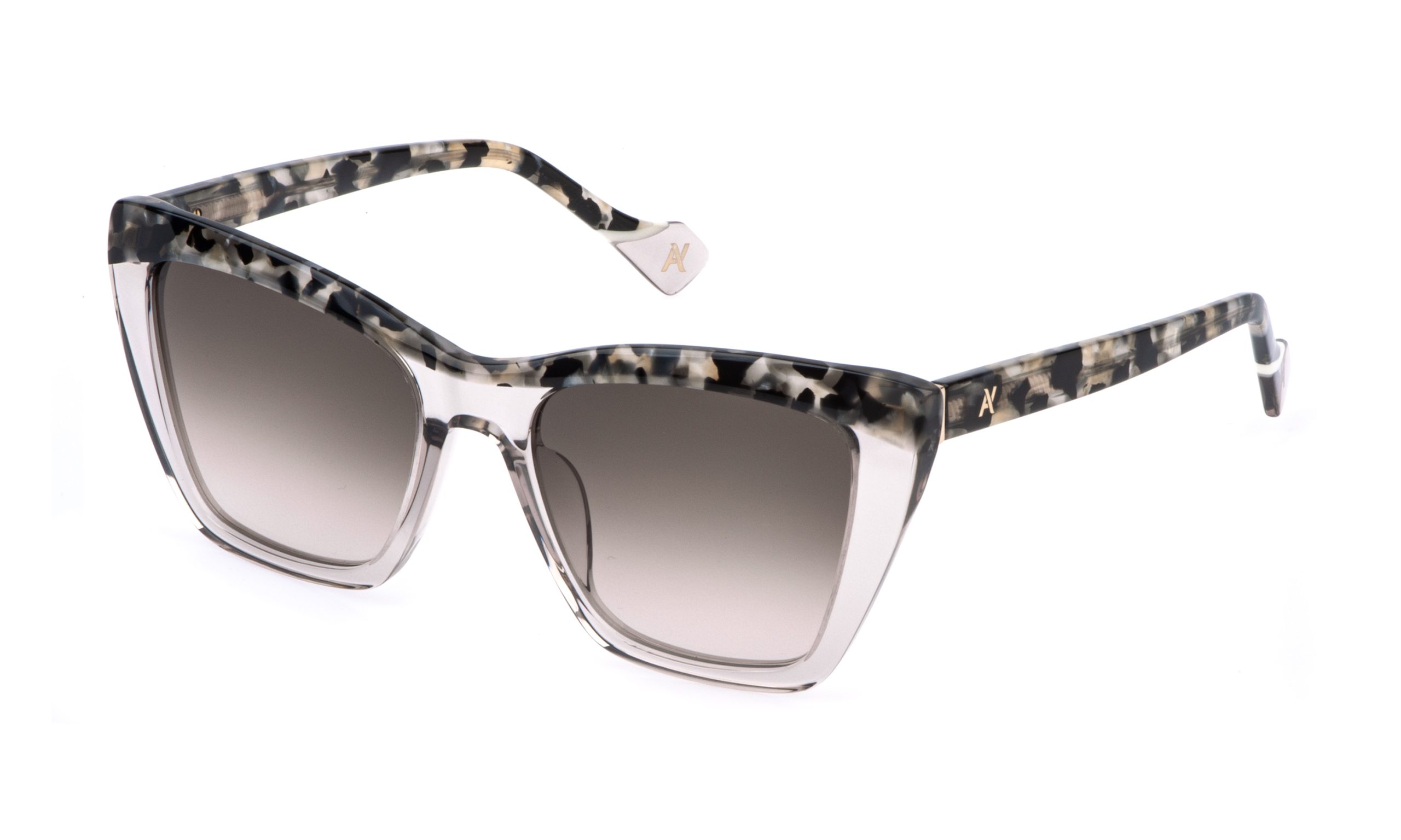 The Homa sunglasses feature a cat-eye acetate front enriched with subtle facets on the upper part. Variants 700Y, 7AY, and AFD have acetate temples adorned with three different-colored inlays evoking the soft waves of the Yalea monogram. V versions feature acetate inlays on the upper front.