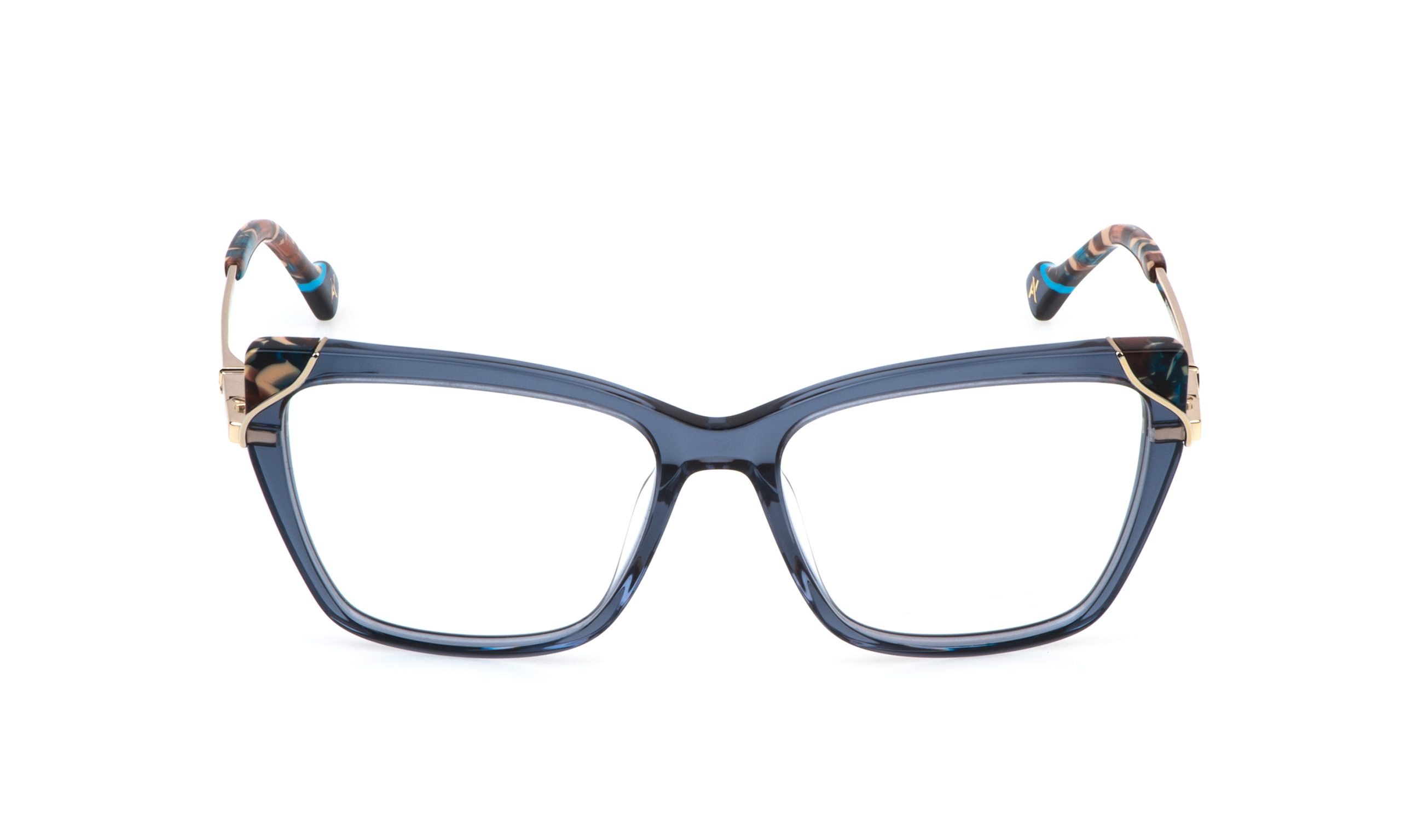 Metrodora is a pair of eyeglasses with a geometric shape characterized by colored gluing on the frame. The metal temples with the elegant 3D monogram of Yalea are equipped with a flex system, making them comfortable eyeglasses perfect for everyday wear.