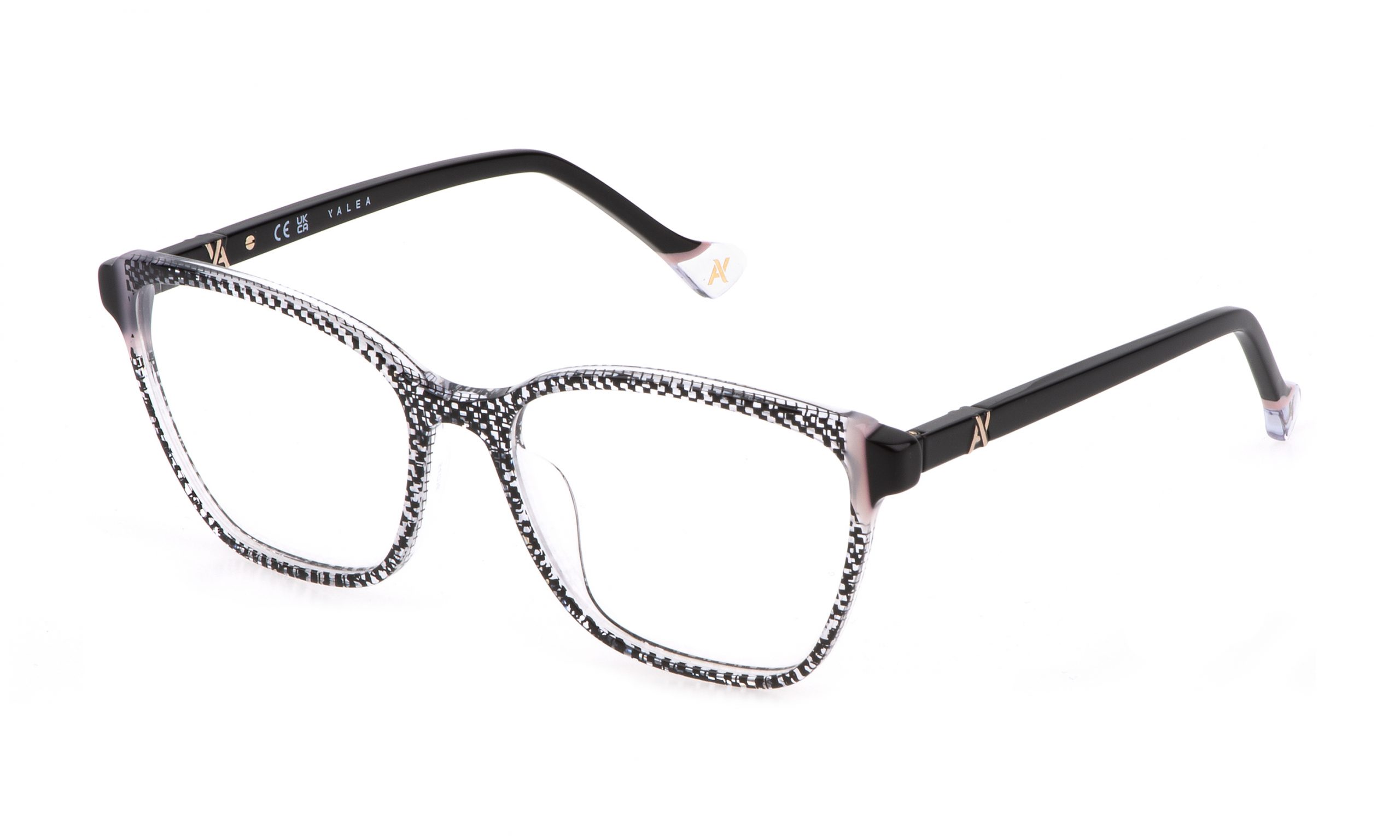 The Shirin prescription glasses feature a square-shaped front piece in acetate. The style stands out for its colourful bonded acetate inserts on the temples and rims. A further eye-catching detail is the Yalea monogram featured on the temples.